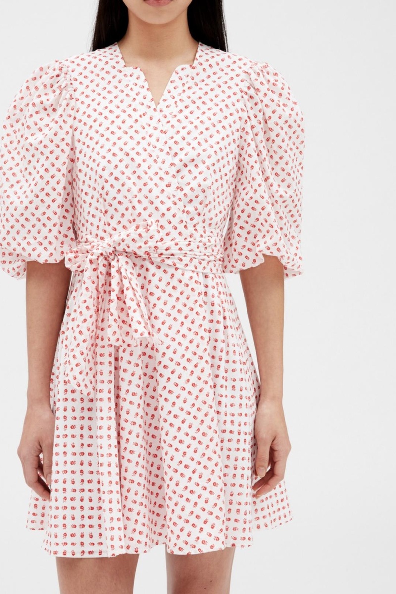 Abito corto con maniche a sbuffo.