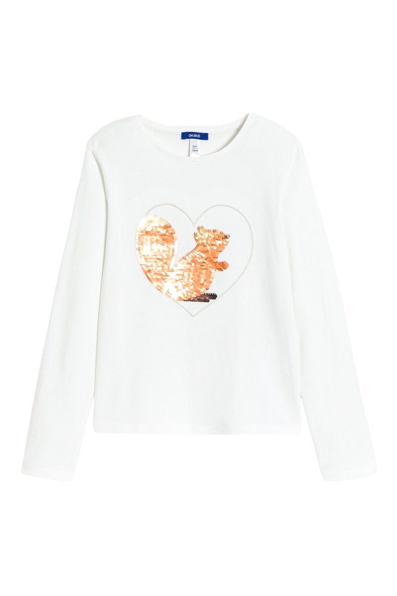 Motivi cuore ricamato e scoiattolo con paillettes sul davanti.