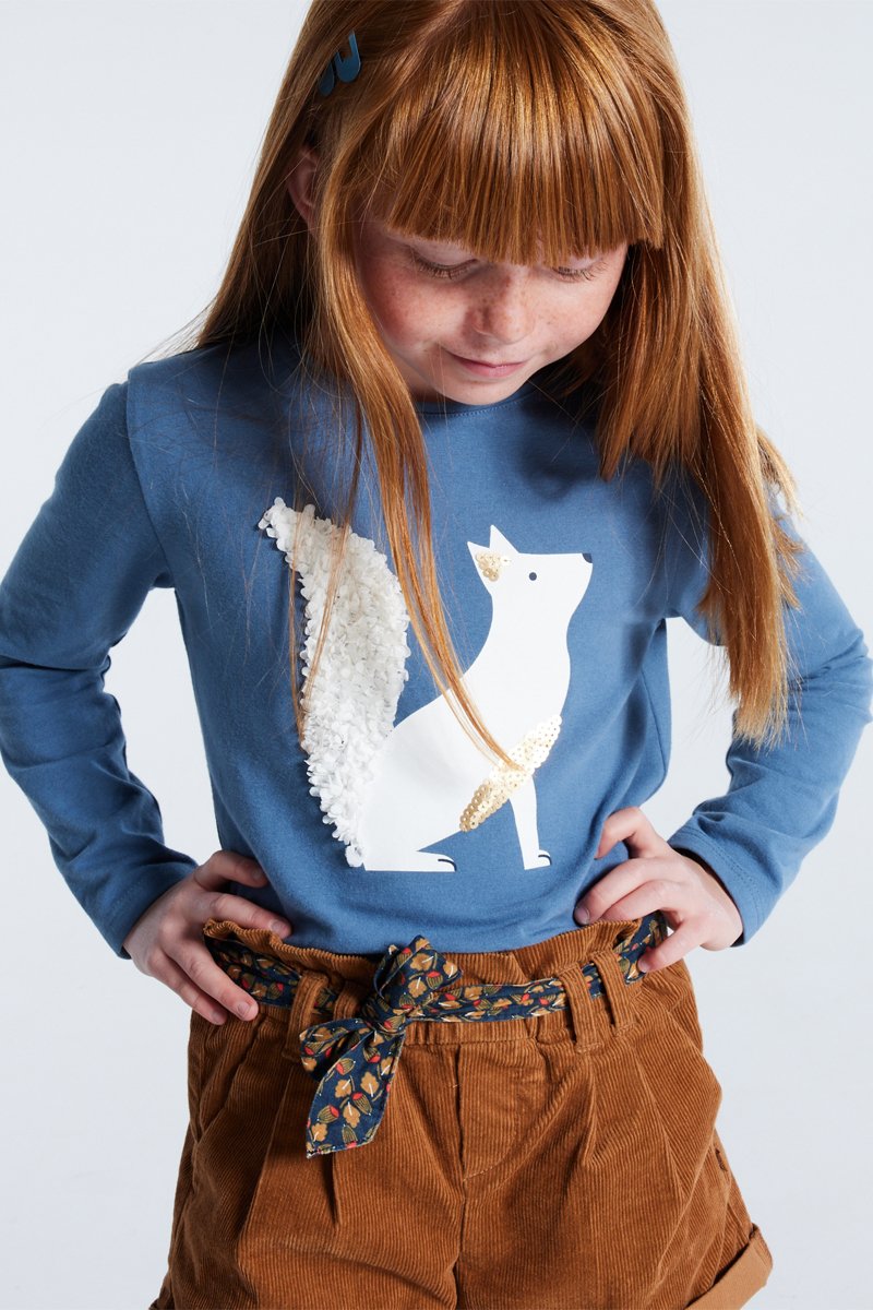Motivo volpe in pelliccia sintetica e paillettes sul davanti.