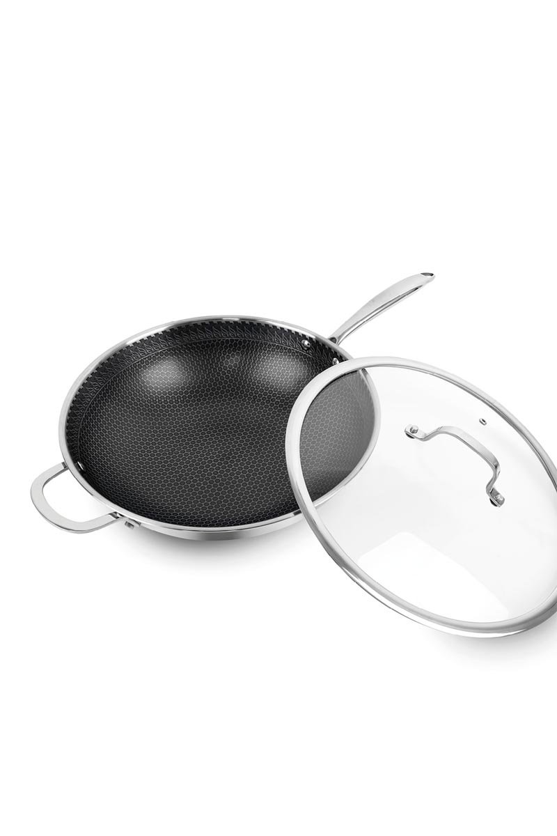 Wok in acciaio inossidabile con coperchio.