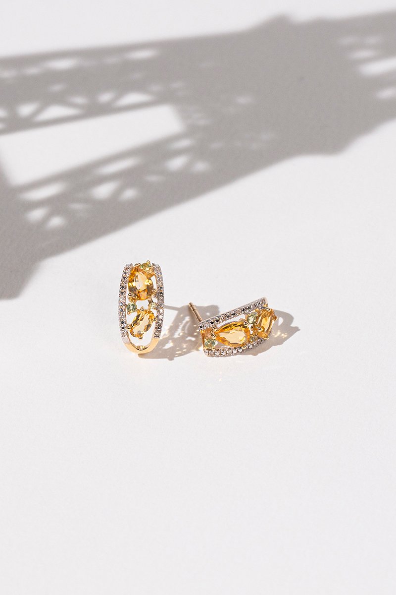 Orecchini in oro giallo con 3 peridoti, 2 citrini e 10 diamanti.