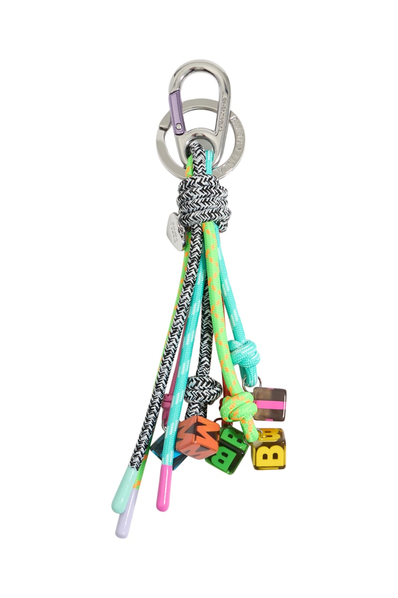 Moschettone e anello metallico con logo in rilievo.