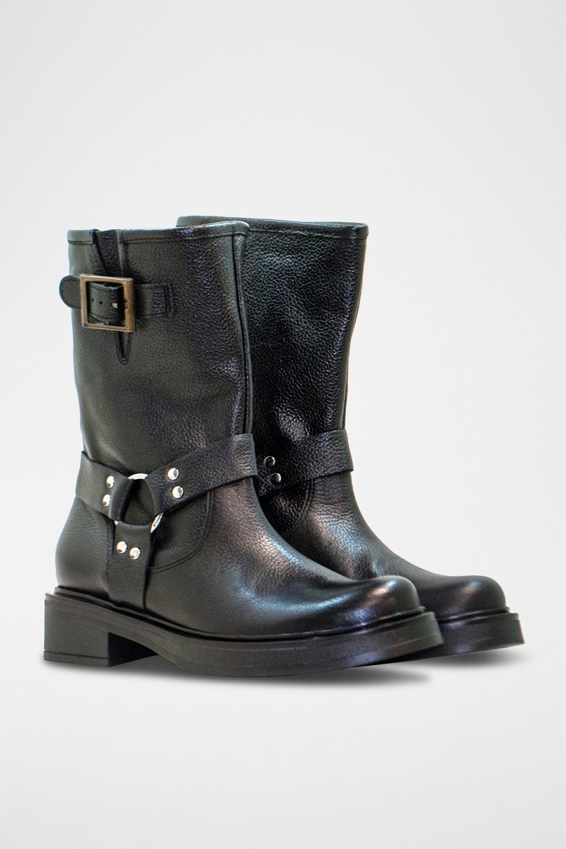 Elastico, cinturini con fibbia e anello metallico sul lato.