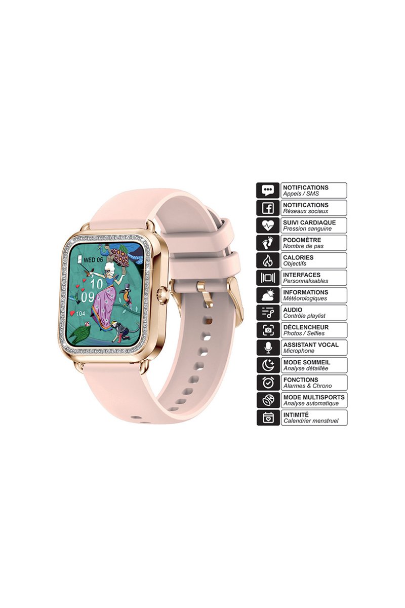 Associato alla sua applicazione dedicata scaricabile gratuitamente, usufruisci di un pannello di funzioni aggiuntive utili per la tua vita quotidiana: sveglia, dati meteorologici, monitoraggio del sonno, cicli mestruali...