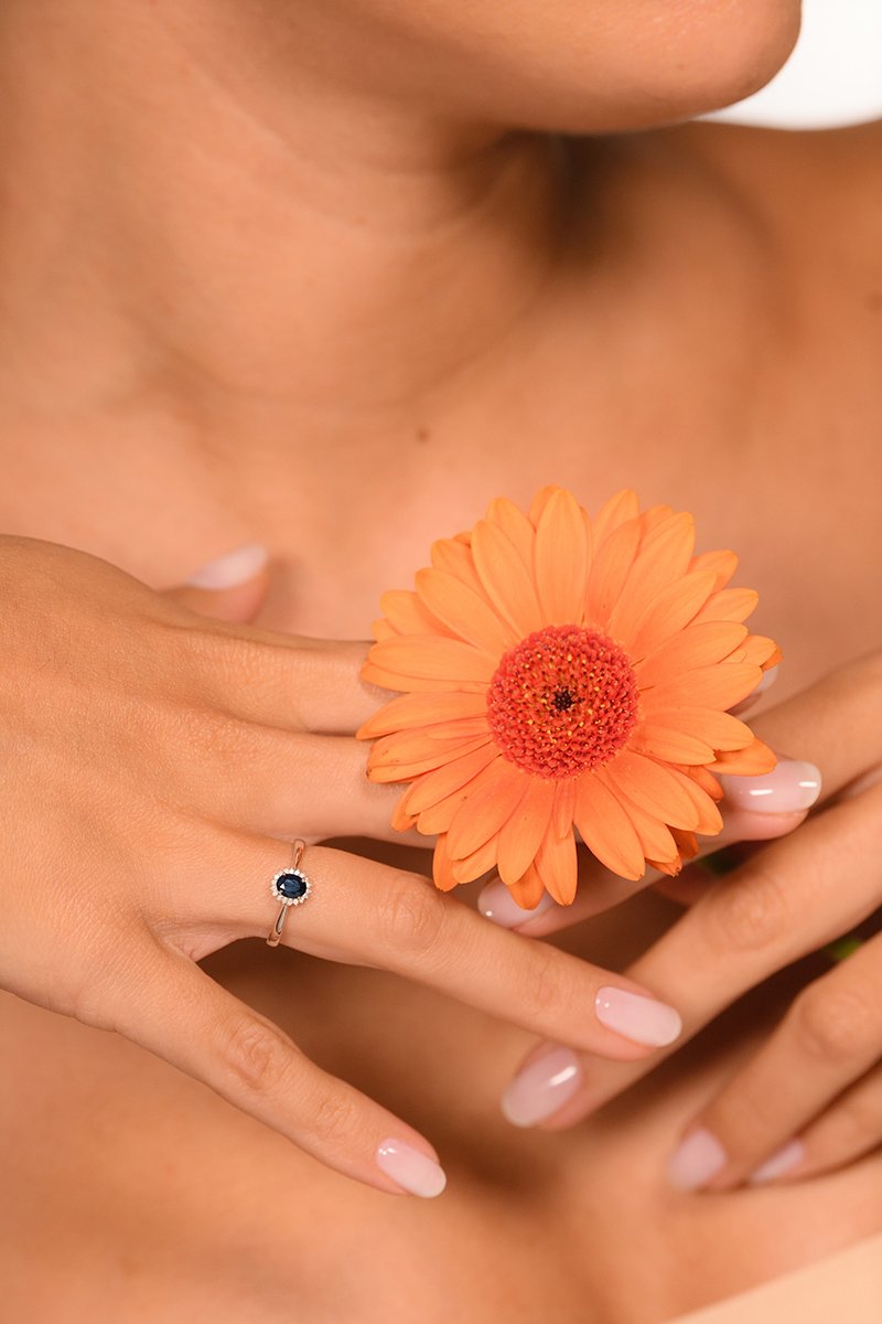 Anello in oro bianco con 18 diamanti e uno zaffiro.