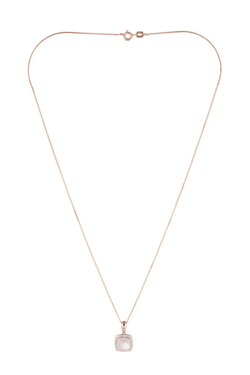 Ciondolo in oro rosa con 36 diamanti e un quarzo rosa.