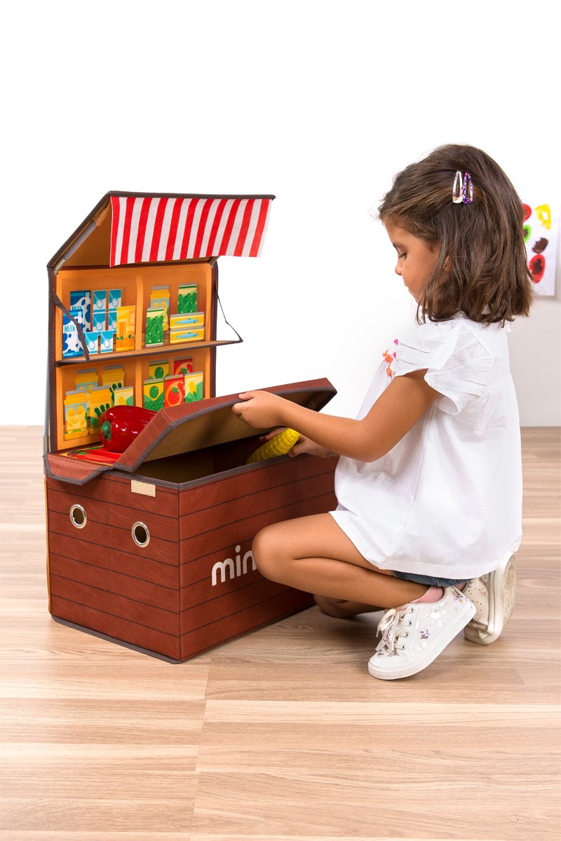 Una volta aperta, ricrea un mercato in cui i bambini possono riconoscere e ricreare diverse situazioni quotidiane, con il supporto di frutta e verdura Miniland (venduta separatamente).