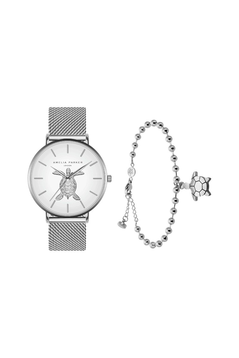 Cofanetto orologio al quarzo in acciaio e bracciale Sea Turtle