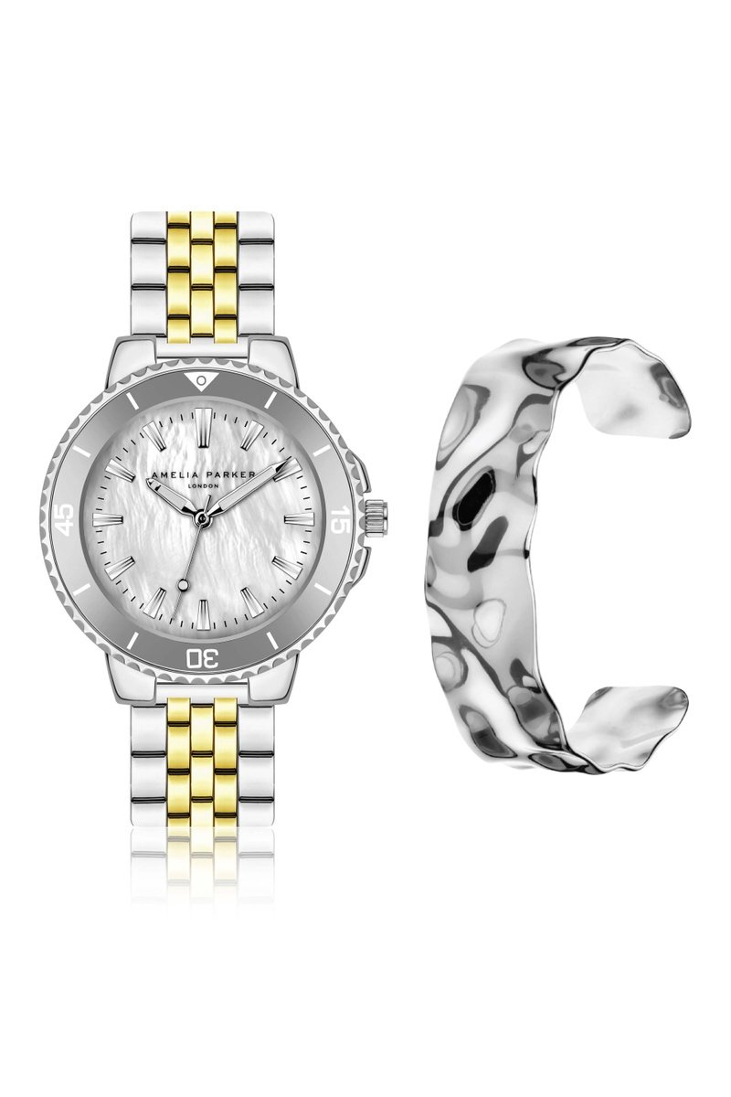 Cofanetto orologio al quarzo e bracciale bangle in acciaio Clayne - Madreperla