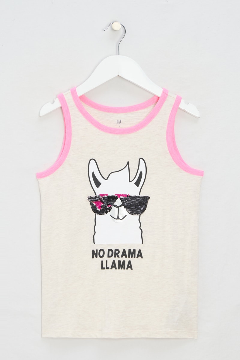 Paillettes, scritta e motivi fantasia sul davanti.