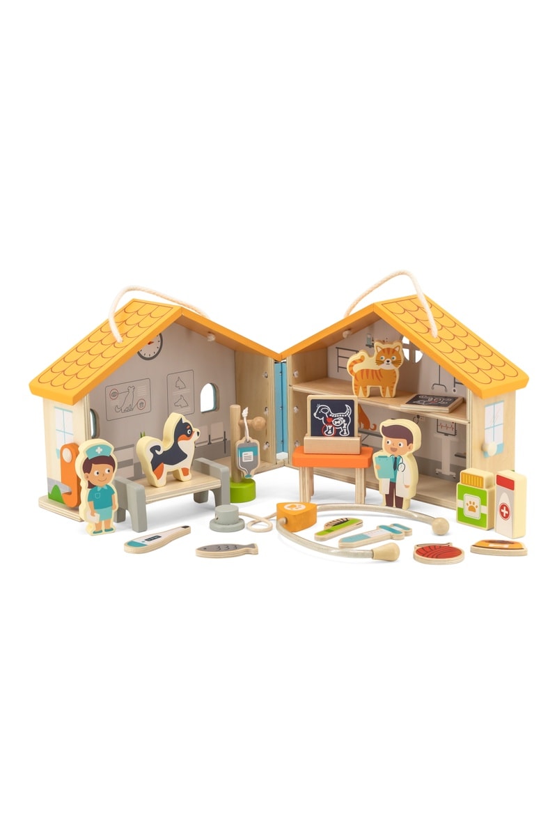Il cofanetto comprende 19 pezzi, tra cui accessori medici come uno stetoscopio, una siringa e un termometro.