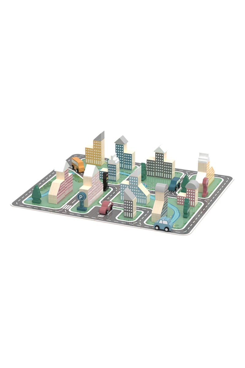 È incluso un puzzle da pavimento per creare un paesaggio urbano. I piccoli architetti possono così divertirsi a progettare la loro città. I blocchi di diverse dimensioni offrono una moltitudine di possibilità.