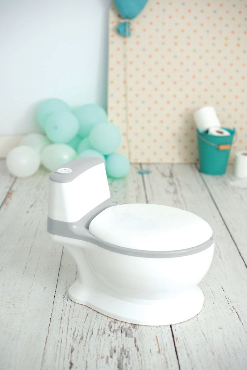 Simile a un WC per adulti, con tavoletta e serbatoio.