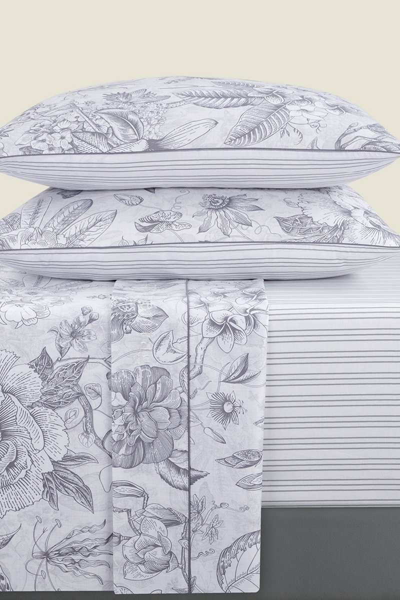 Parure lenzuola in raso di cotone 80 fili/cm²Fleurs esquissées - Bianco e grigio