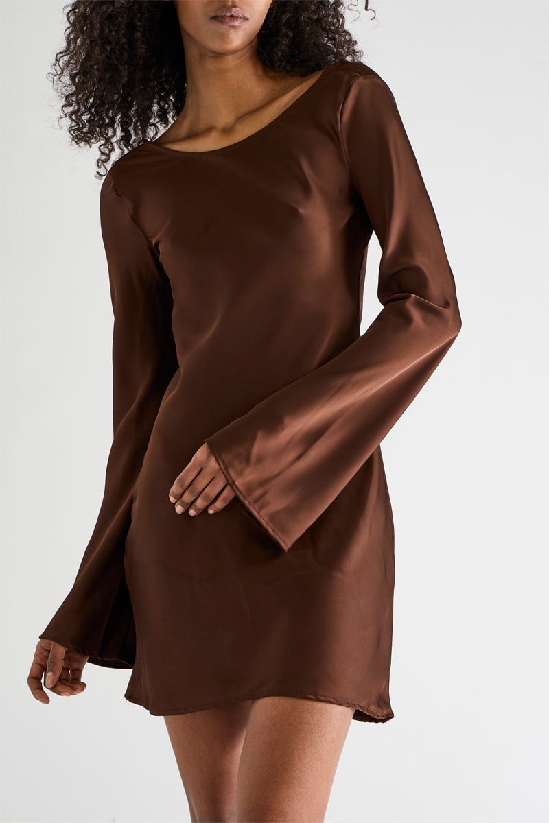 Abito corto con maniche lunghe svasate.