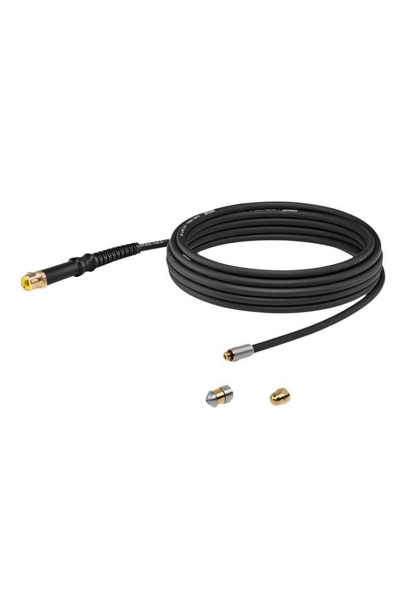 La confezione include due tipi di ugelli: l'ugello a 360° per la manutenzione preventiva delle tubature e l'ugello classico per sturare e rimuovere i tappi. L'anello di marcatura consente di seguire l'avanzamento nella tubatura.