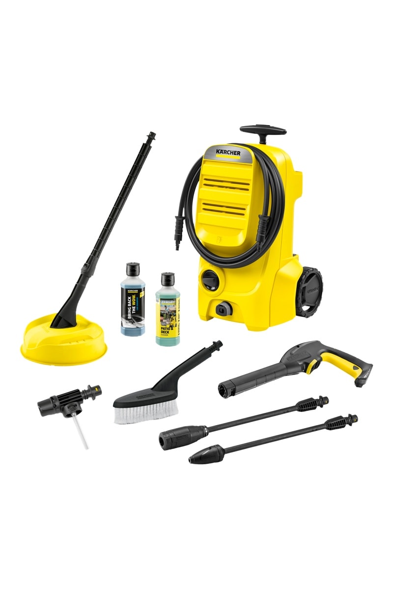 Comprende una lancia Vario Power, un ugello rotante, una spazzola, un getto schiuma, un flacone da 500 ml di detergente per auto e un tubo flessibile ad alta pressione di 6 metri. Il pacchetto Home è composto da un lavasuperfici T 1 e un contenitore da 500 ml di detergente per superfici esterne. Resa per area indicativa: 25 m²/h.