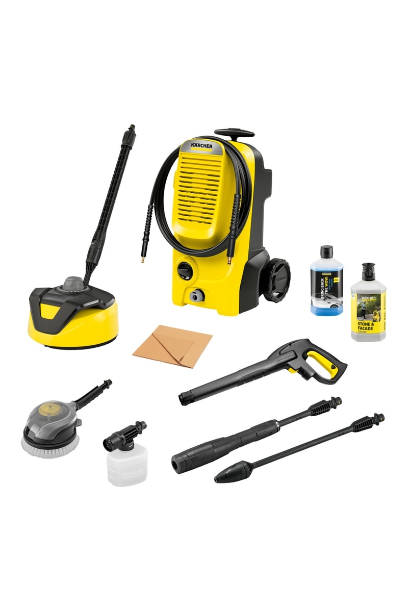 Il Kit Home con il pulitore per pietre e facciate 3 in 1 (1 l) e il lavasuperfici T5 consente di pulire senza schizzi e in modo molto efficace le superfici lisce. Inoltre, l'apparecchio è dotato di un'impugnatura a grilletto con sistema Quick Connect e di un tubo ad alta pressione di 8 metri. La lancia Vario Power consente all'utente di adattare la pressione alla superficie in un batter d'occhio, con la possibilità di riporre facilmente il tubo flessibile sul corpo della macchina.