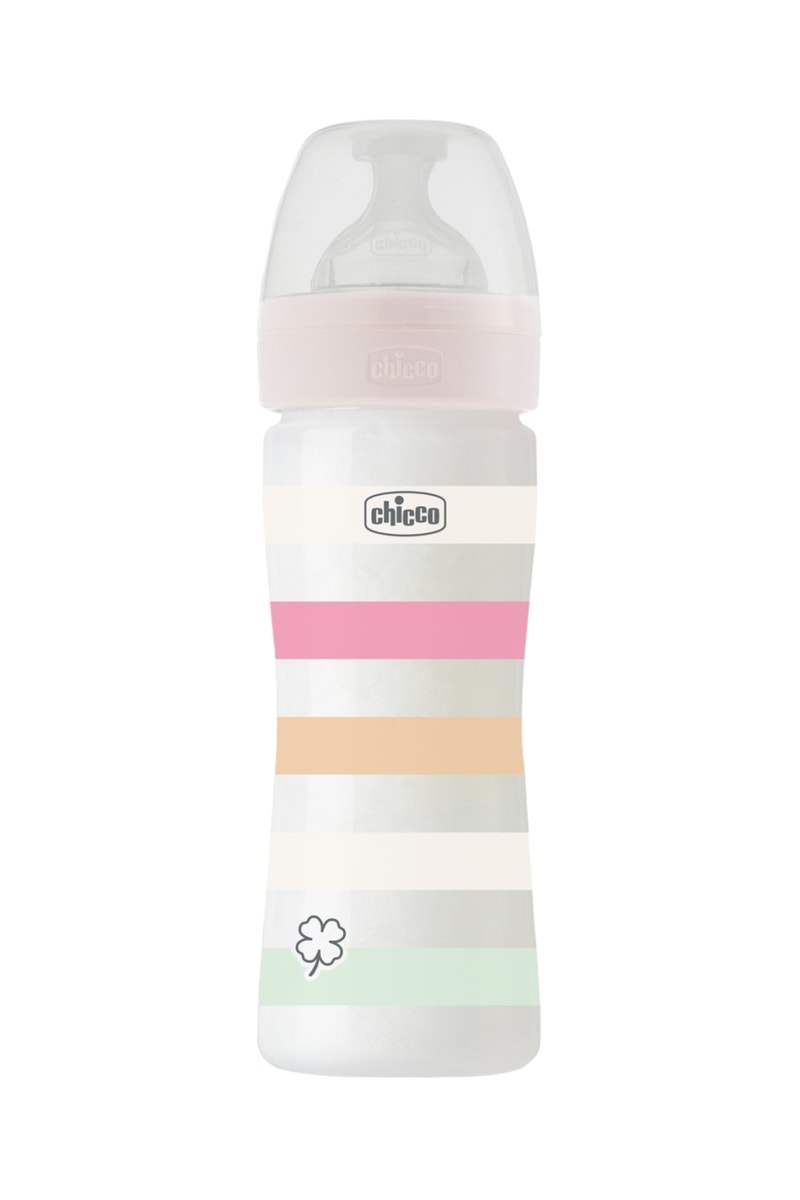 Biberon con tettarella fisiologica in silicone extra morbido.