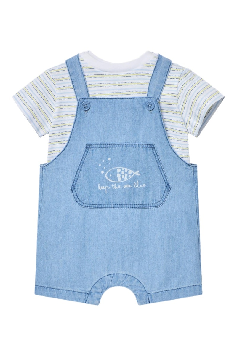 T-shirt e salopette corta in jeans - Bianco e celeste