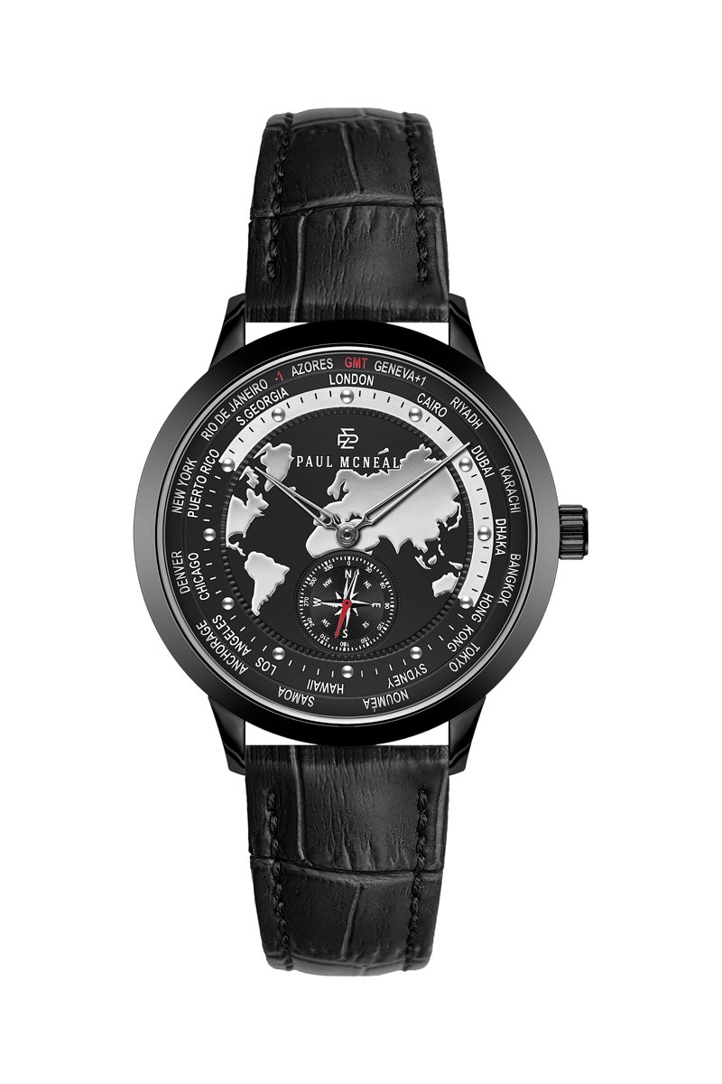 Orologio al quarzo in pelle - GMT - Bussola - Nero e argentato - Paul McNeal