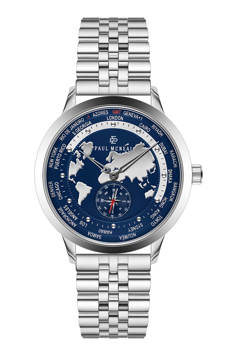 Orologio al quarzo in acciaio - GMT- Argentato e navy - Paul McNeal