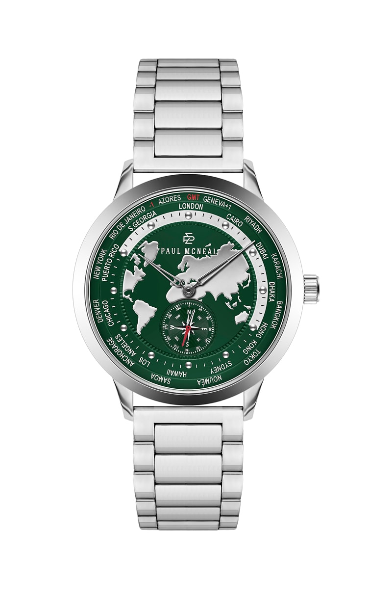 Orologio al quarzo in acciaio - GMT - Bussola - Argentato e verde scuro - Paul McNeal