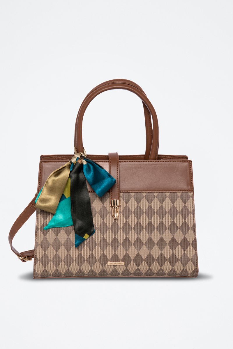 Motivi a quadri, inserto in metallo con logo e foulard amovibile sul davanti.