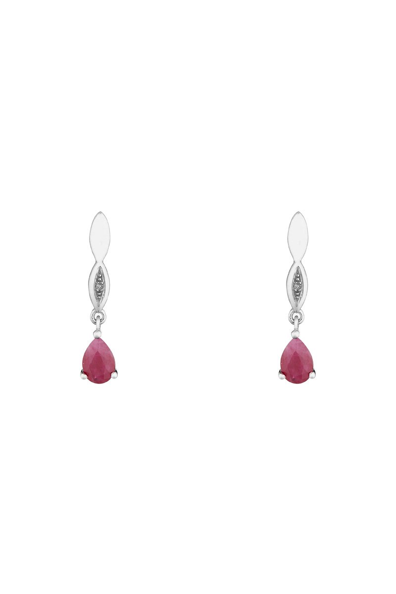 Orecchini pendenti in oro bianco con un diamante e un rubino.