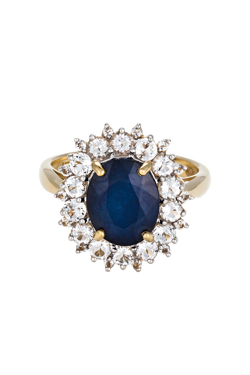 Anello in oro giallo con 28 topazi e uno zaffiro.