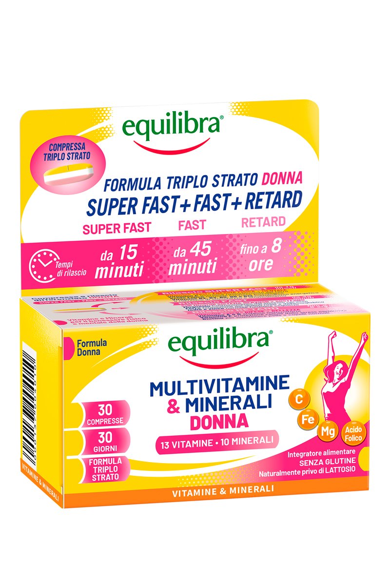 Integratore alimentare in compresse triplo strato formulate con tecnologia innovativa SUPER FAST + FAST + RETARD che permette un rilascio graduale nel tempo delle vitamine e dei minerali.