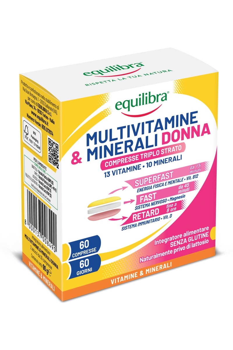 Multivitamine & Minerali Donna Equilibra è un integratore alimentare in compresse a triplo strato, formulate con l’innovativa tecnologia SUPER FAST + FAST + RETARD, che permette un rilascio progressivo nel tempo di vitamine e minerali.