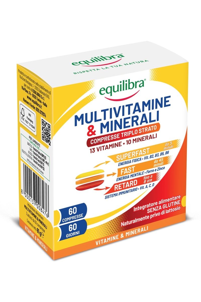 Multivitamine & Minerali Equilibra è un integratore alimentare a base di vitamine e minerali in compresse a triplo strato, formulate con l’innovativa tecnologia SUPER FAST + FAST + RETARD, che permette un rilascio progressivo nel tempo di vitamine e minerali.