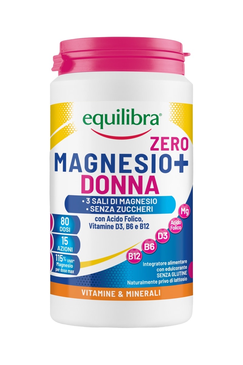 Magnesio+ Donna Zero Equilibra è un integratore alimentare a base di 3 sali di magnesio, vitamine D3, B6 e B12, e acido folico.
