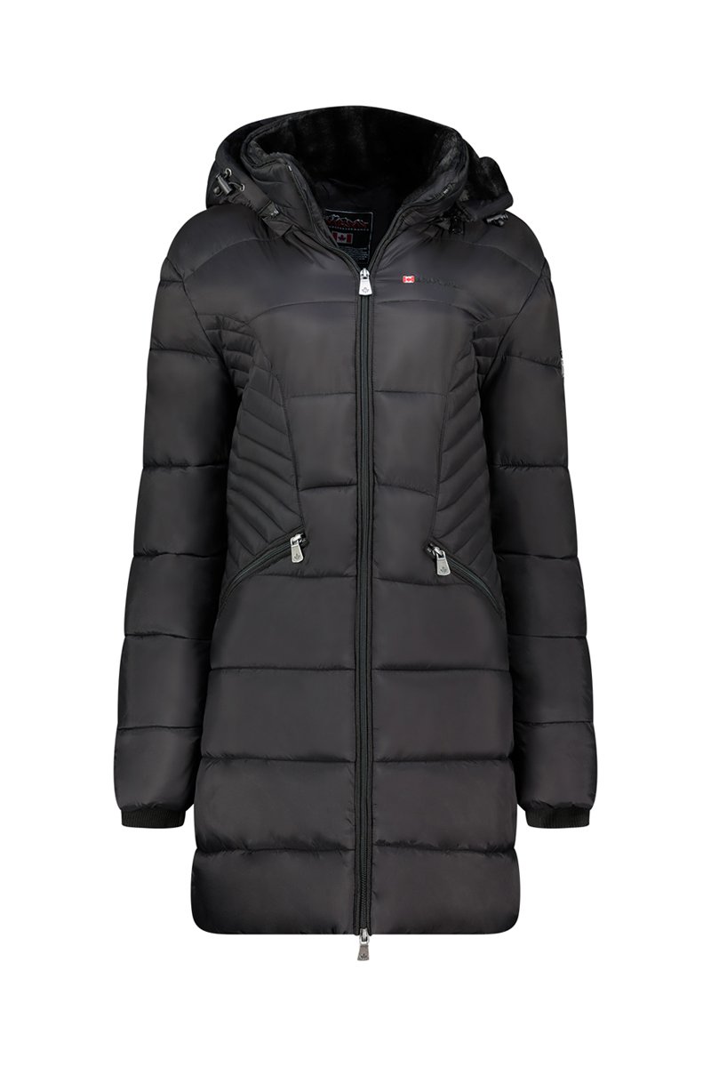 Piumino lungo con cappuccio amovibile con coulisse e fermacorda.