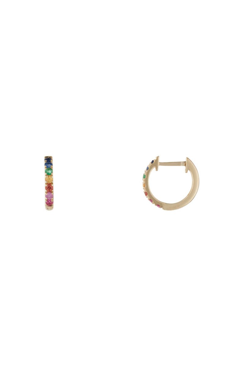 Orecchini a cerchio in oro bianco con uno smeraldo, un rubino, 2 zaffiri arancioni, uno zaffiro rosa e uno zaffiro giallo.