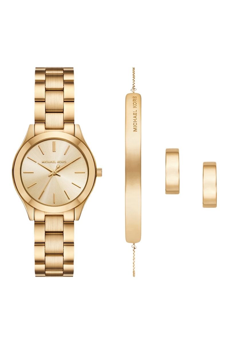 Cofanetto orologio al quarzo in acciaio, bracciale e orecchini