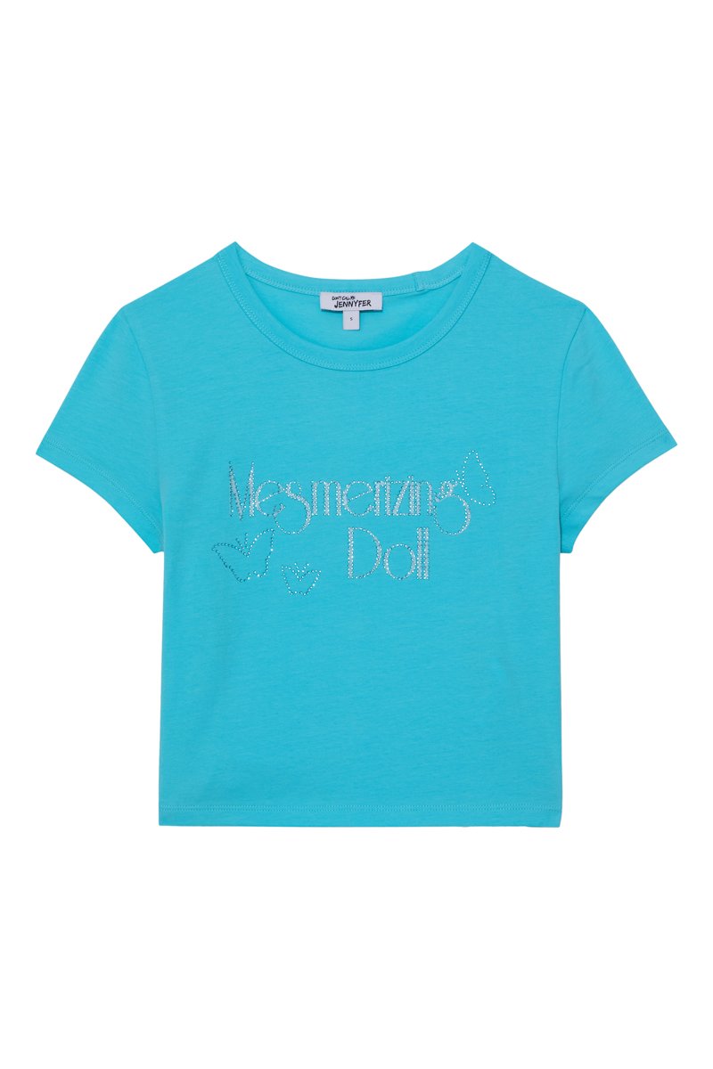 Scritta, motivi farfalle e strass sul davanti.