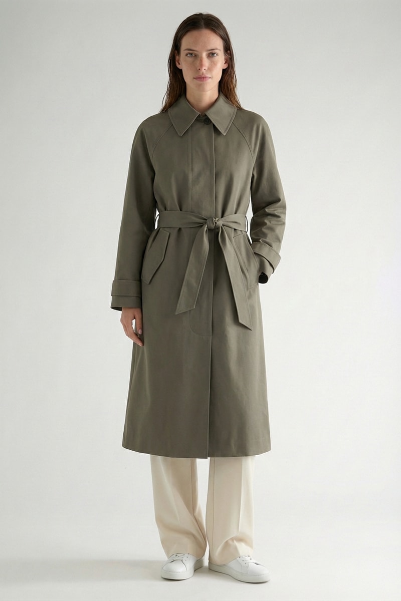 Trench a maniche lunghe raglan con linguetta abbottonata e passante.