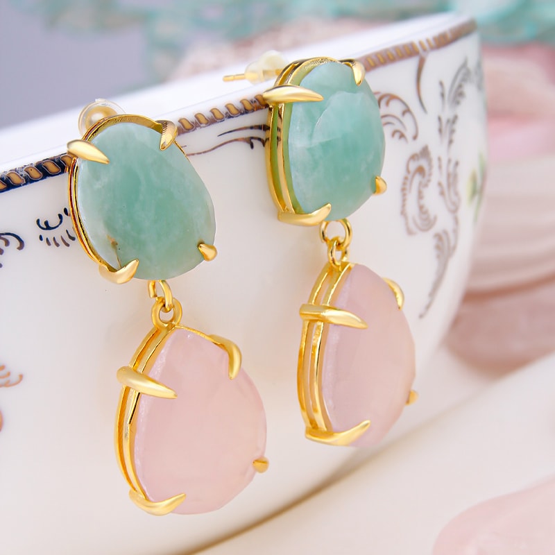 Scopri questo paio di orecchini eleganti, un accessorio raffinato che esalterà il tuo stile ogni giorno. Realizzati con pietre di amazzonite e quarzo rosa, aggiungono un tocco di sofisticazione e luce al tuo look!