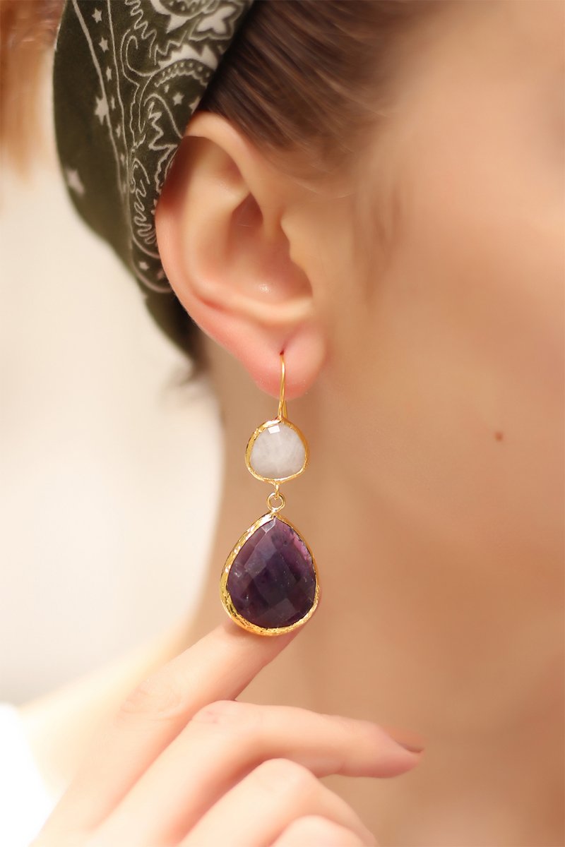 Orecchini in bronzo con una pietra di luna e un’ametista.