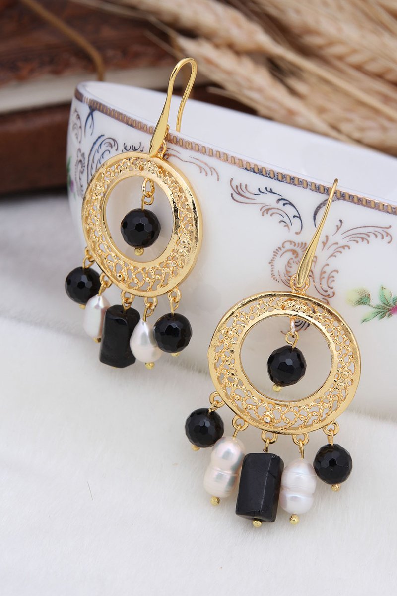 Orecchini pendenti placcato oro giallo con 4 onici e perle di imitazione.