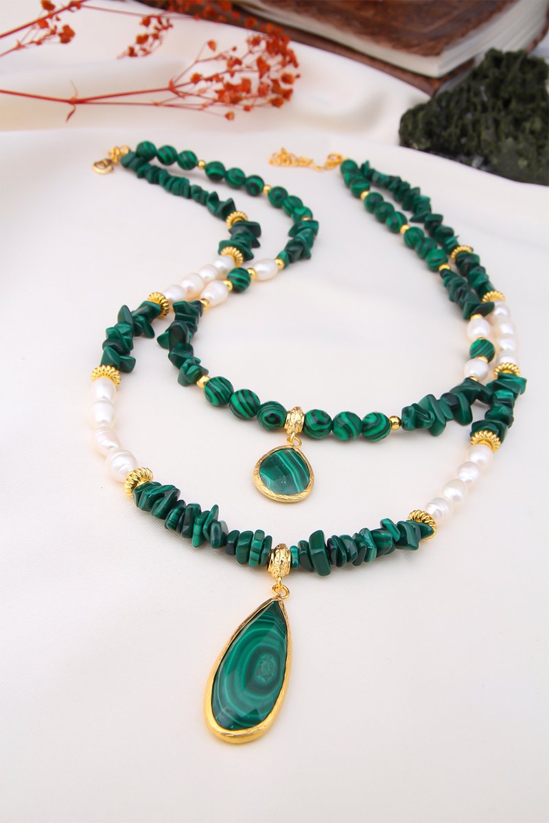 Collana sautoir con malachiti e perle coltivate.