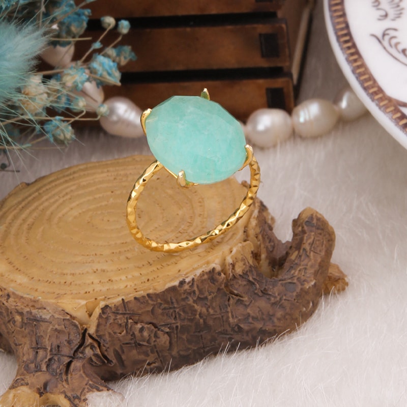 Lasciati conquistare da questo anello in ottone placcato oro con un’amazzonite, pietra dai toni blu-verde. Il design elegante e senza tempo di questo bijou porterà un tocco di raffinatezza alla tua mano, unendo lo splendore dell'oro alla delicatezza unica dell'amazzonite.