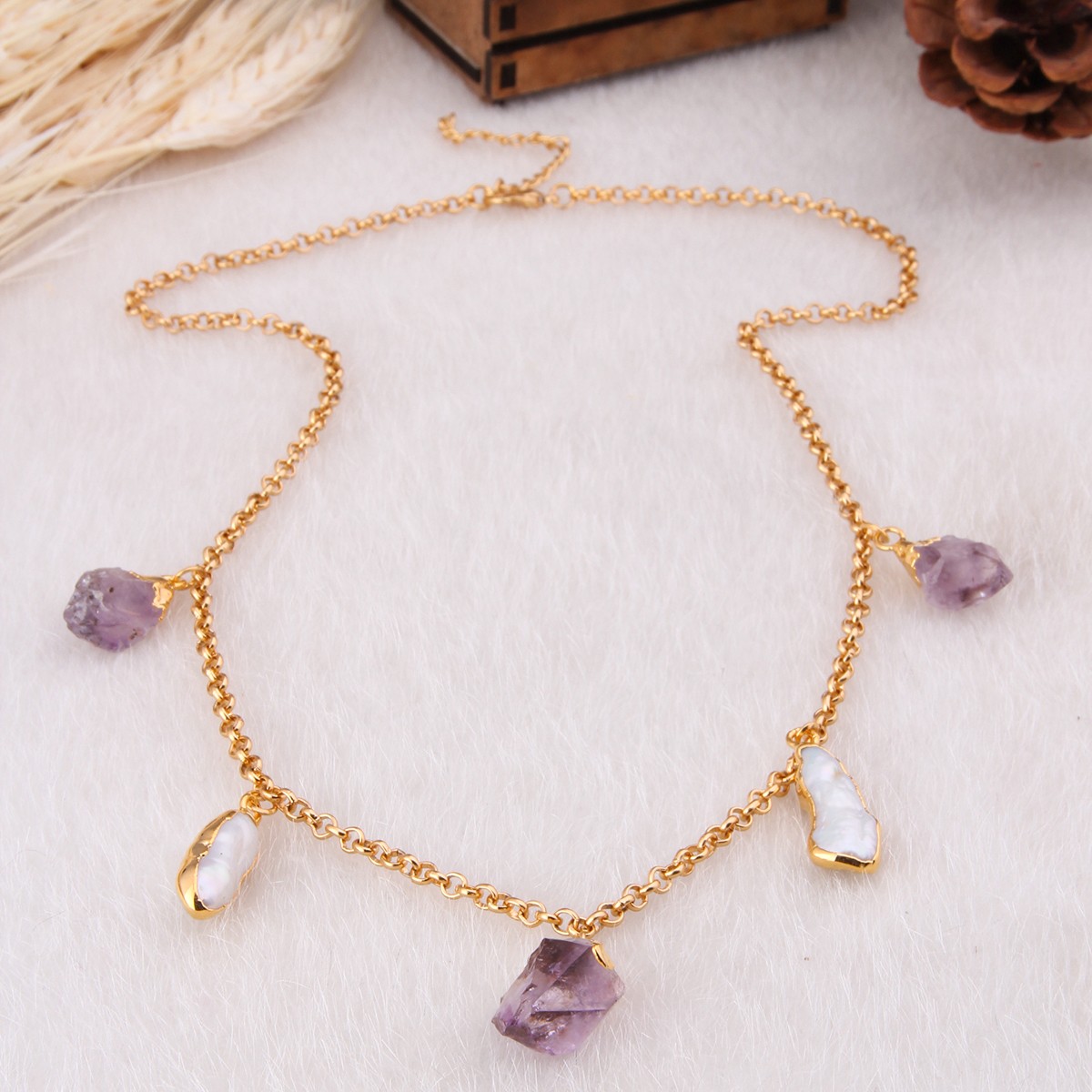 Collana - Ottone placcato oro, ametista e perla