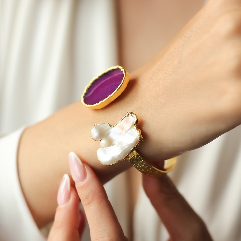 Lasciati conquistare da questo bracciale in ottone placcato oro con agata e perle. Un gioiello audace per un tocco sofisticato ai tuoi look.