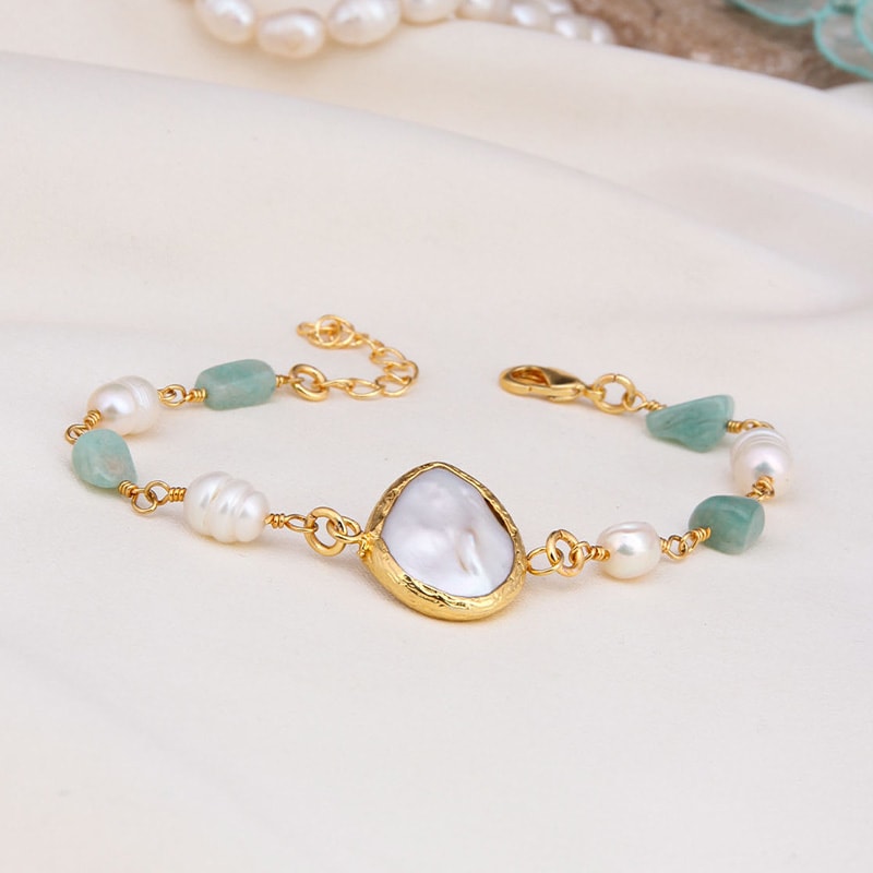 Bracciale in ottone placcato oro con amazzoniti e perle delicate.