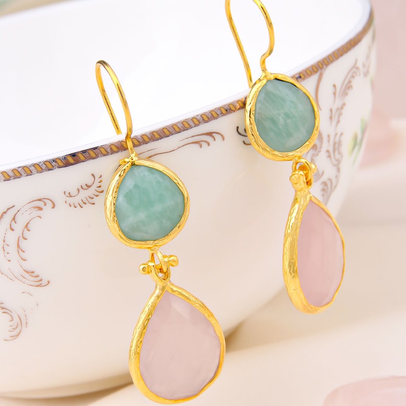 Orecchini - Ottone placcato oro, amazzonite e quarzo rosa
