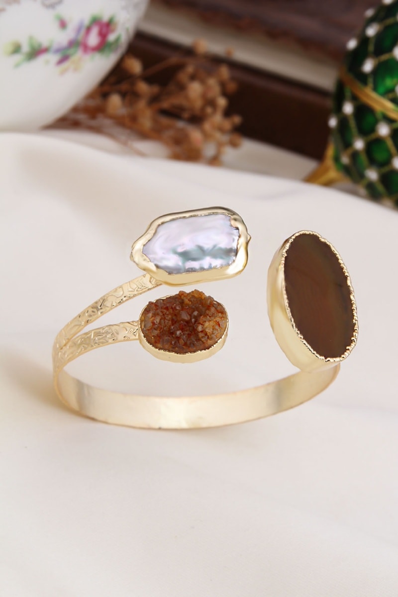 Bracciale bangle aperto con 2 agate e una perla coltivata.