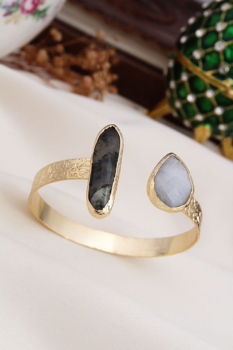 Bracciale bangle aperto con una prehnite e una pietra di luna.